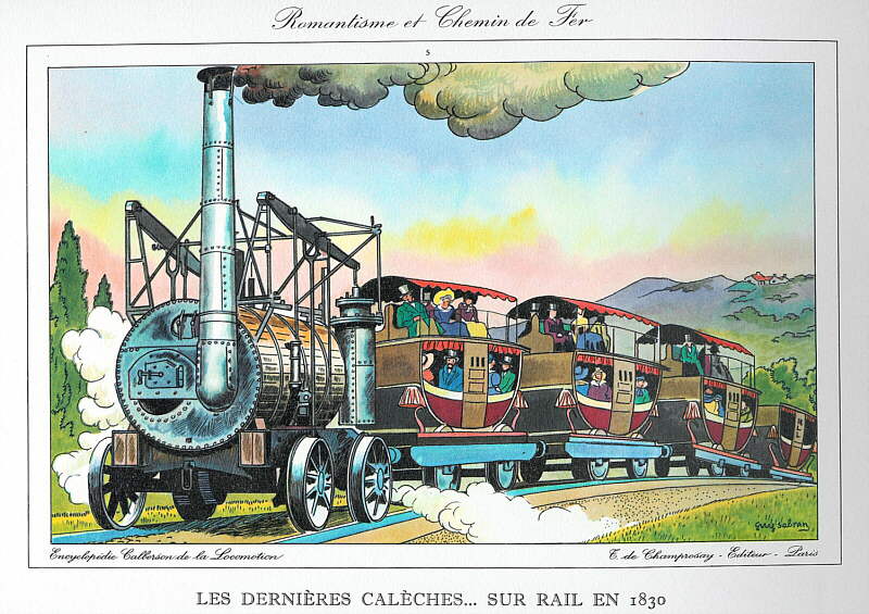 " Les voitures qui faisaient le service railway lyonnais, en 1838, étaient de simples diligences, c'est-à-dire des boîtes de sapin, trop courtes, sans lumières et sans air... A chaque instant, le moteur changeait de nature : aux portes de Saint-Étienne, c'était une locomotive qui traînait le convoi; plus tard, des chevaux remplaçaient la locomotive; ailleurs, c'est-à-dire dans une forte montée, on se sentait hissé par des cordages qu'enroulait sur un tambour une machine à vapeur fixe... "