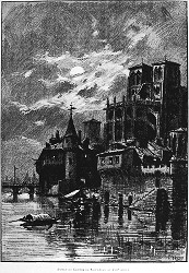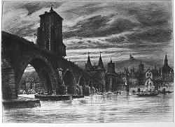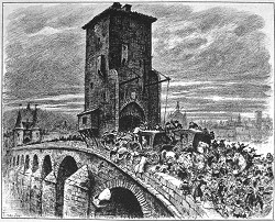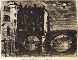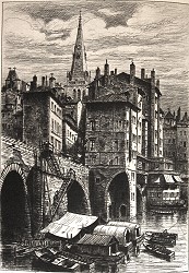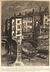 le Pont du Change en 1840 - l'Arche Merveilleuse, la Mort-qui-trompe et le Café Neptune. |