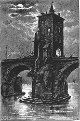 Lyon - Vue idéale de l'ancien Pont de Saône, avec la Tour de l'Empire, et la Tour de France aux deux extrémités |