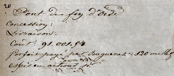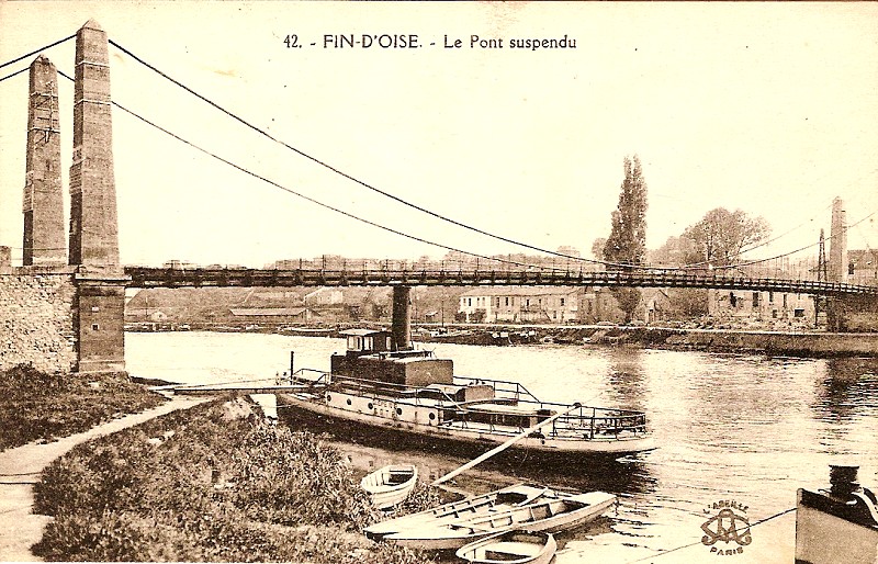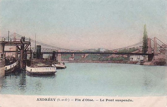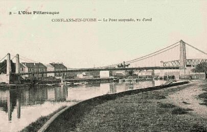 La construction de ce pont, situé sur l'Oise sur la commune de Conflans en 1836, en remplacement du bac existant dit de "Fin d'oise", fut approuvée par décret le 2/12/1836. Nous ne disposons que de peu d'autres informations sur la construction de l'ouvrage. Cette réalisation apparaît dans les archives ci-dessus, dans la liste des ouvrages de la compagnie des frères Seguin. Son commissionnement a débuté en Avril 1837, et le réglement a eu lieu le 20 Décembre 1838.