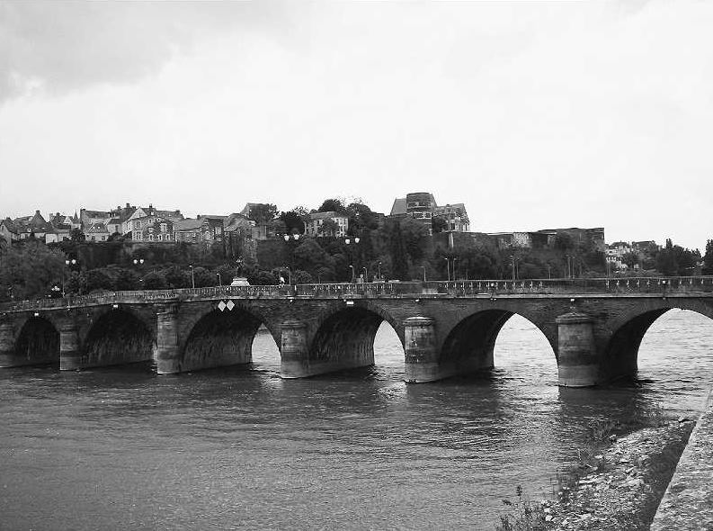 Les grands ponts, situés en plein centre d'Angers, sur la Maine, étaient initialement au nombre de deux, le "Grand pont" et le "Petit Pont ou Pont de la Tannerie". Ce dernier permet alors de relier l'île de la Savatte à Doutre. Le Grand Pont qui s'appela aussi "Pont du Centre" et s'appelle désormais "Pont de Verdun", fut construit au Xième siècle par Foulque Nerra, comte d'Anjou. Il supporte alors plusieurs maisons et moulins. En 1576, alors bâti en pierre, les arches du pont sont enlevées par une crue. Ils furent refaits en l'an 1615. Il fut finalement très largement rénové à partir de 1845 sous la direction l'ingénieur en chef Dupuit, afin d'élargir son tablier et élever ses arches. Il possède alors 8 arches pour une longueur de 116 mètres. Le nouveau pont est ainsi inauguré en Novembre 1847 et prend peu après le nom de Pont du Centre. De nombreux projets ont été envisagés pour l'adapter aux besoins de la circulation mais tous rejetés ou abandonnés et ainsi le vieux pont de Verdun de 1848 continue d'assurer seul la liaison intra-urbaine centrale d'Angers.