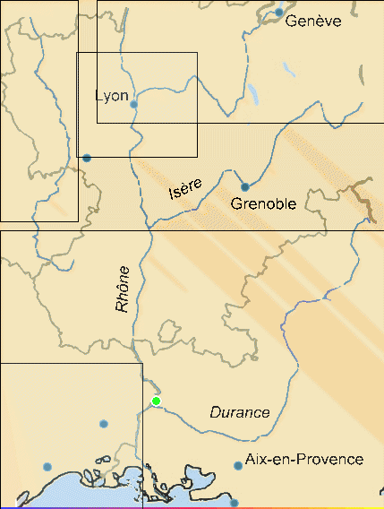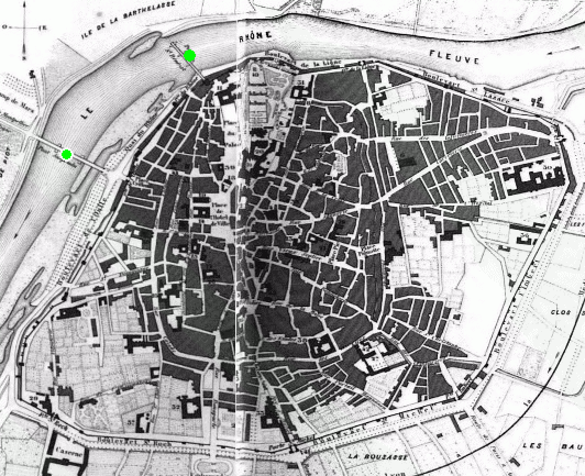 Bien qu'à cet endroit le Rhône soit divisé en deux, il est évoqué en 1838, puis décidé en 1840 de construire un pont suspendu sur le petit bras du Rhône. Les nombreuses contestations retarderont le projet qui verra finalement le jour en 1845, confié à l'entrepreneur Jules Seguin (frère de Marc). Le pont mesure environ 220m de long.