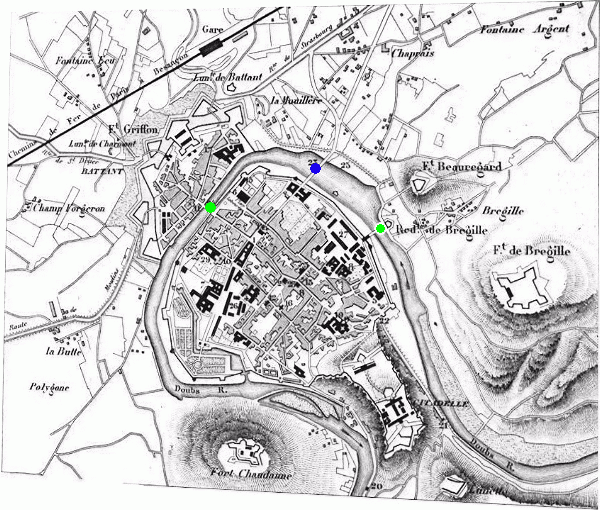 La gravure ci-contre montre le pont de Brégille en place, en face de la porte fortifiée d'accès à la ville, mais le pont des Chaprais n'est toujours pas présent --> elle date vraisemblablement de 1837.