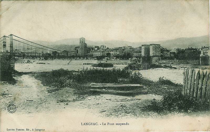 La construction du pont de Langeac a été autorisée par l'ordonnance royale du 15/10/1833 (2). Cette même ordonnance approuve l'adjudication des travaux et du péage (passée le 12/8/1833) en faveur de Camille Paret , en contre-partie d'une subvention de 30000 Fr et une concession de durée de 98 ans. Selon (1), le pont de Langeac sur l'Allier a été construit en 1835, et comporte 1 travée unique, suspendue par fil de fer, de 62.5m de long pour une largeur de tablier de 4.4m.