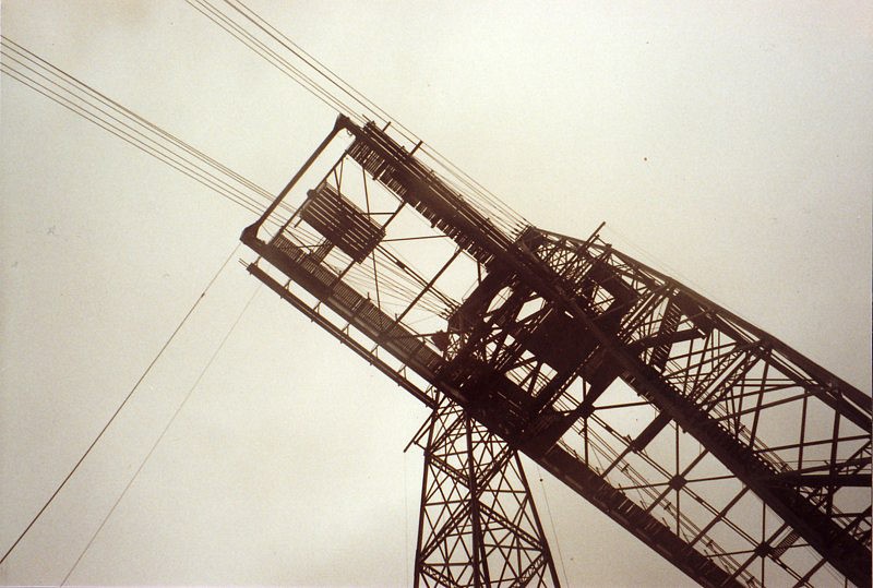 Les quatre pylônes sont ensuite montés par les ouvriers de Ferdinand Arnodin en quatre mois et sept mois seront nécessaires pour installer le tablier.