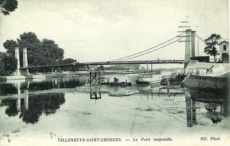 La construction d' un pont suspendu sur la Seine, reliant Villeneuve-Saint-Georges à Villeneuve-le-Roi fut décidée en 1839. Le pont fut achevé en 1843. Il fut coupé en 1870 et rétabli après la guerre. Le tablier en bois fut remplacé par un tablier semi-rigide après un accident survenu en 1919. Le pont lui-même fut remplacé par un nouvel ouvrage achevé en 1939. Les pylônes qui se dressaient encore sur la commune de Villeneuve-Saint-Georges ont été rasés en 1994.