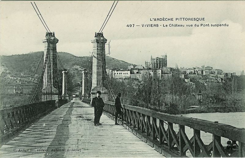 La construction du pont suspendu à Viviers sur le Rhône est autorisée par le bulletin de lois du 10/7/1845 (1). L'ouvrage (2) précise que ce pont est de construction mixte, suspendu en partie, fait de 7 travées ou arches, pour une longueur totale entre culées de 341.60m. Il fut mis en service le 13 Octobre 1845 - date de départ de la concession de 95 ans.